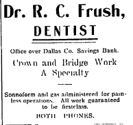 1906: Dr. R.C. Frush, dentist - office over Dallas County Savings Bank