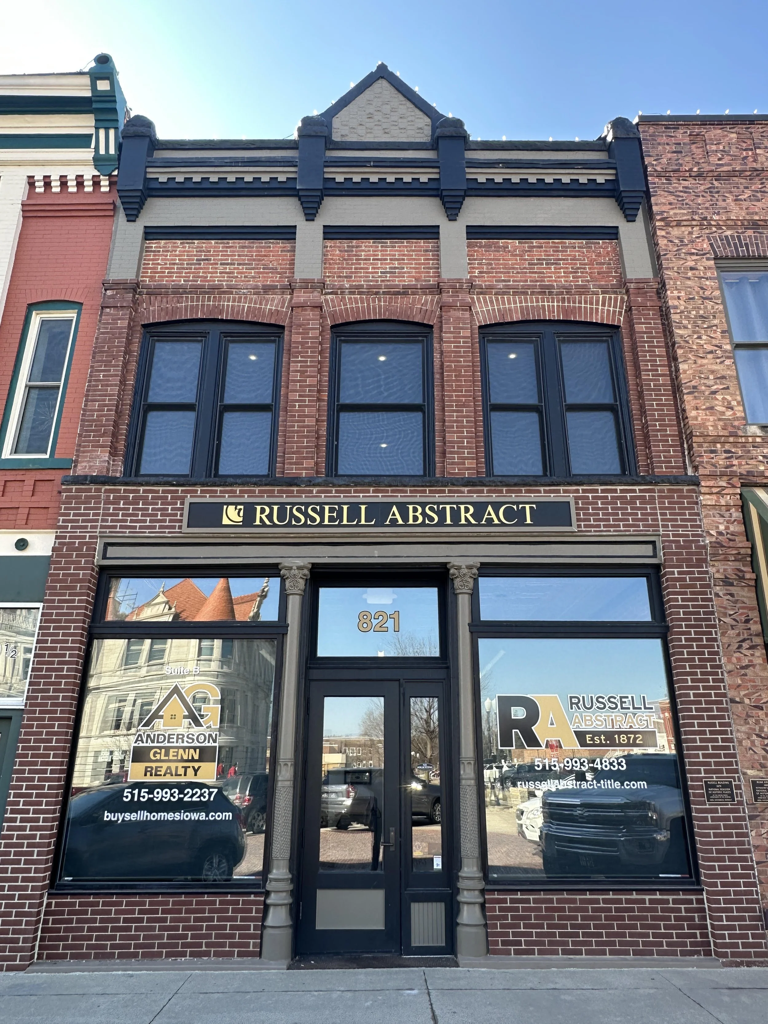 For more than 150 years, a single building in Adel Public Square Historic District has been continuously maintained, occupied, and reinvested in by the same family. Located at 821 Main Street, it represents one of the most complete and enduring examples of generational preservation in Iowa. It was originally built around 1880s as a hardware store and acquired by J.W. Russell in 1872 for use as Russell Loan & Title Company. The Russell Abstract & Tile Company is the oldest business in Adel.